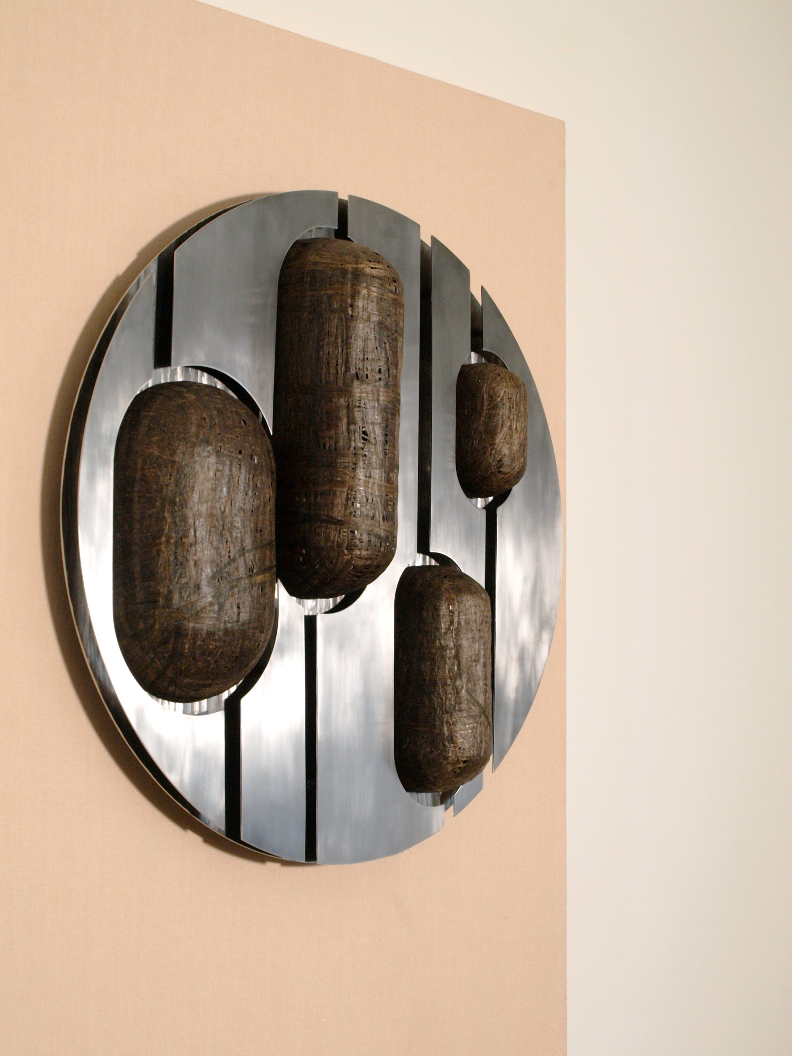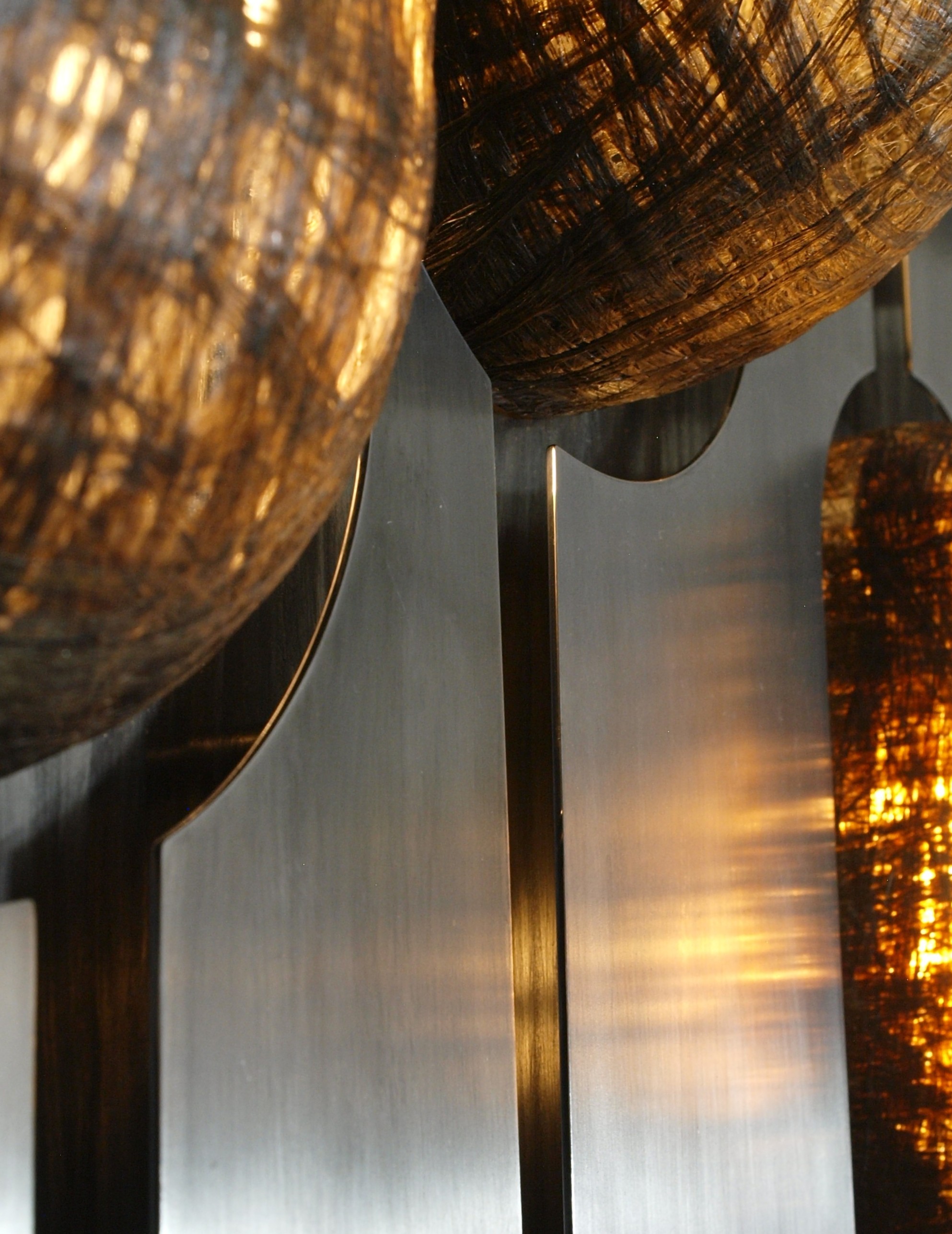 LA SUITE DU RÉCIT SE SITUE DANS LES ÉLÉMENTS EN CHANVRE QUI JOUENT SUR LEURS FORMES ET LEURS TAILLES COMME DANS UN CHAMP. LA PROFONDEUR ET LE BROUILLAT DES PIEDS DE CHANVRE BOUSCULÉS PAR LE VENT SE DESSINE PAR LE TEXTURAGE DE L'ACIER. HORIZON RACONTE TOUS CES SOUVENIRS ET TOUTES CES SENSATIONS À LA FOIS. HORIZON N'EST ALORS PLUS SEULEMENT UNE LAMPE, C'EST UNE INSTALLATION, UN TABLEAU CRÉÉ À PARTIR D'UN PATRIMOINE LOCAL.